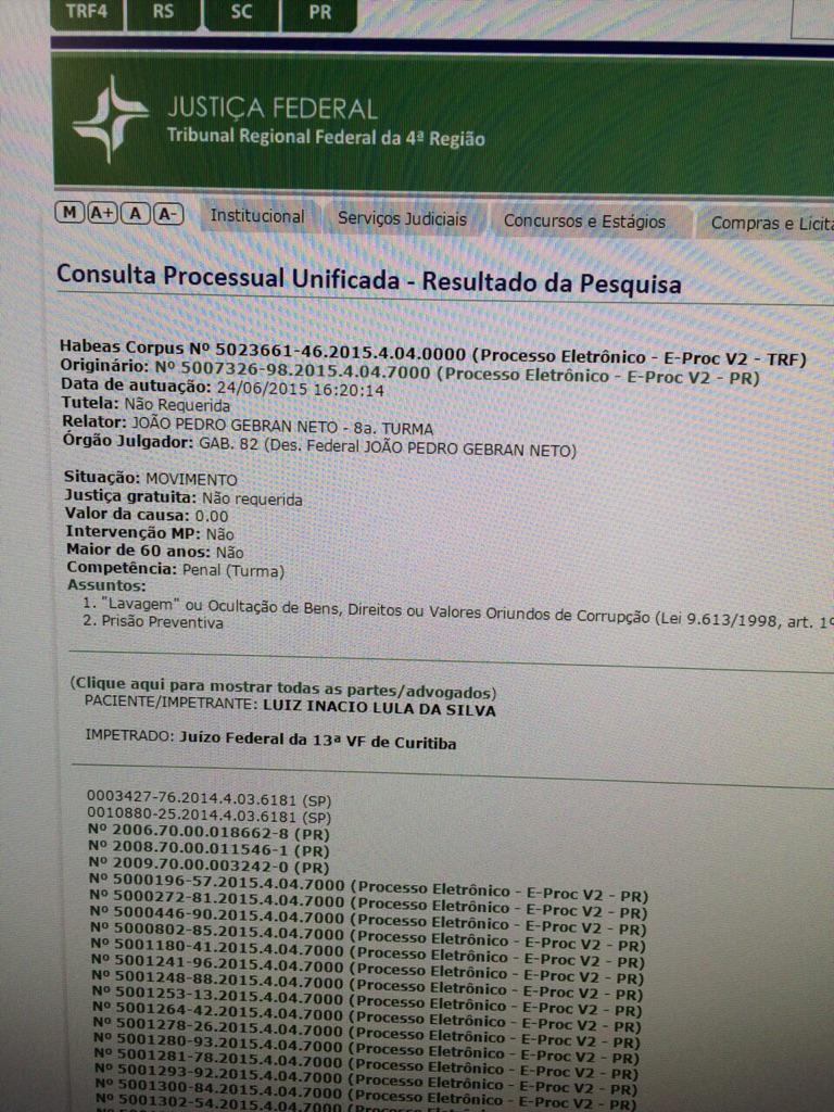 O autor enviou o pedido de habeas corpus por email à secretaria do TRF-4. A ação foi distribuída para o desembargador João Pedro Gebran Neto, relator do processo, que deve analisá-lo.